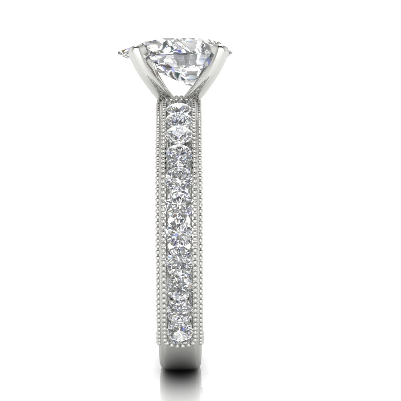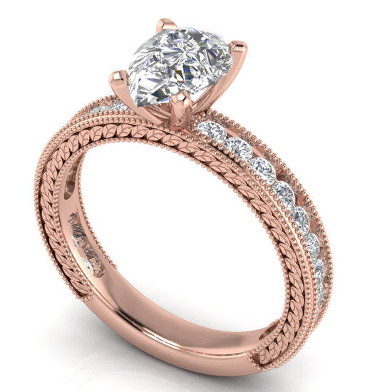This engagement ring is available in 14K or 18K white, yellow, or rose gold and features a stunning pear-shaped moissanite at its center. The channel-set milgrain detailing along the band adds a touch of elegance, accentuating the ring's vintage charm and providing a beautiful setting for the brilliant moissanite.